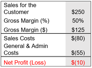 A small, one-hour job is sold to a customer for $250. The COGS for the job is $125 so the gross profit is 50% at $125. At first glance, this may appear profitable. However, this does not consider all overhead costs, or Selling, General and Administrative (SG&A) expenses, associated with the sale as shown in the calculation below. This includes paying the sales team to sell the order ($80) and administrative costs to process the order ($55). With these costs subtracted from the sale, the business has now lost money (-$10).