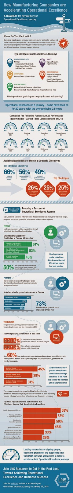 - An Automation World article from 2010 titled, Enabling Manufacturing Operational Excellence, offered a unique twist to the issue by highlighting the IT role in the OE process. A key component is the traceability and genealogy of all products and components. To quote, “Compliance and governance represent a key dimension of operating excellence. The requirements of agencies such as the U.S. Food and Drug Administration and others encourage excellent operation, while placing additional data gathering and reporting requirements on manufacturers.”
