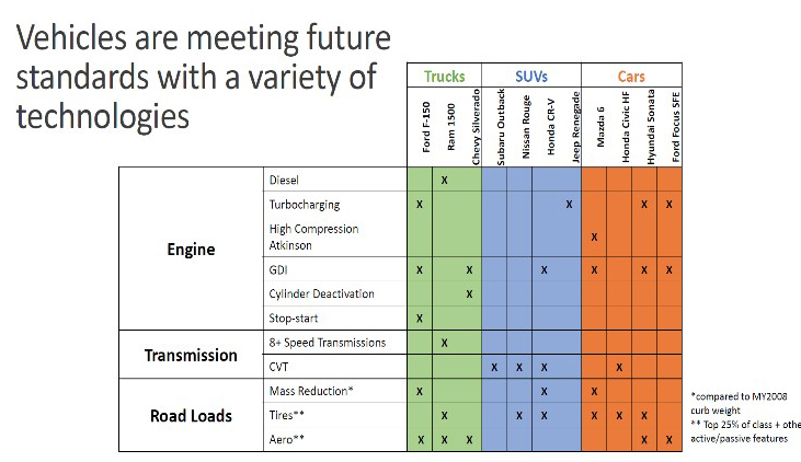 With average fuel economy still in the 25 – 30 mpg range today, how will the car companies reach the end goal? In his presentation to the Center for Automotive Research last August, Chris Grundler, Director of the EPA in Ann Arbor, presented the following charts showing that a number of vehicles are well on their way to achieving the vehicle class goals. The pathway to higher mileage includes improvements in engine technology, transmissions, and road loads. Reduction of mass is also playing a role with many of these models. This evidence points out that there is not one solution out there, but a combination of many that will get the car companies where they need to be.