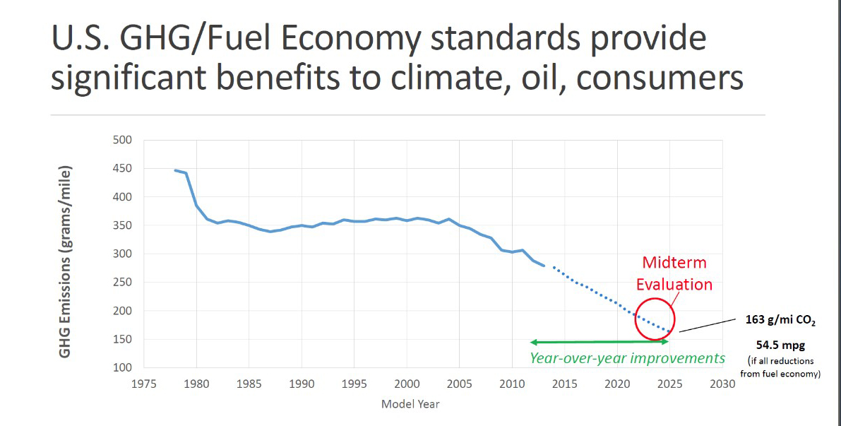 The fervor to reduce greenhouse gas emissions and increase fuel economy is stronger than ever at the EPA. Consumers and automotive companies are on board for continued improvements to meet the 2025 standard of 163 g/ml CO2 (54.5 mpg) average for all cars sold in the United States. European standards are even tougher, and China and other Asian countries are moving in the same direction. With the emphasis on global vehicle manufacturers, all from Detroit to Yokohama and Wolfsburg, are taking the fuel economy challenge very seriously. A midterm evaluation period is scheduled for June 2016, but it seems unlikely that the conclusions will be anything but to stay to course and push for 54.5 mpg average in 2025. See the following chart from the EPA.