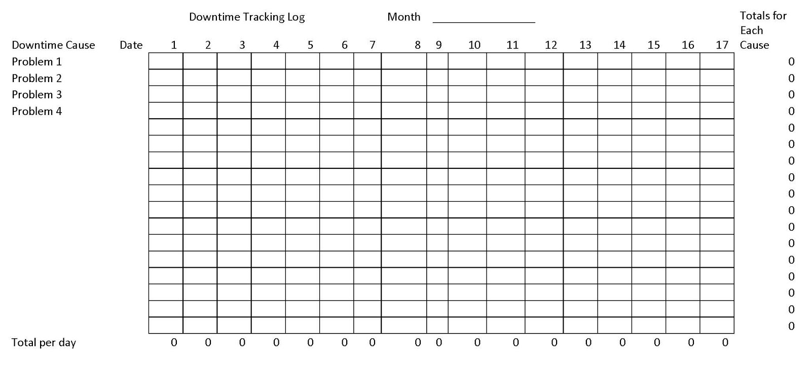 This downtime tracking should also be Pareto’ed, but the following sample layout could be used to collect the data if you don’t already have something: