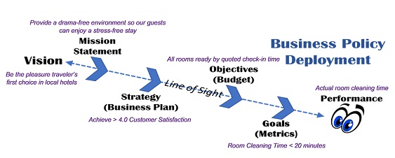 To better understand how this policy deployment is carried out, consider the following case: The new owner of a hotel determines their target market is tourists visiting the local area. With that in mind, her vision is for her business to be the pleasure traveler’s first choice in local hotels. The owner then meets with her leadership team to share her vision. At the meeting, the team creates their mission statement, which is to provide a drama-free experience so guests can enjoy a stress-free stay.