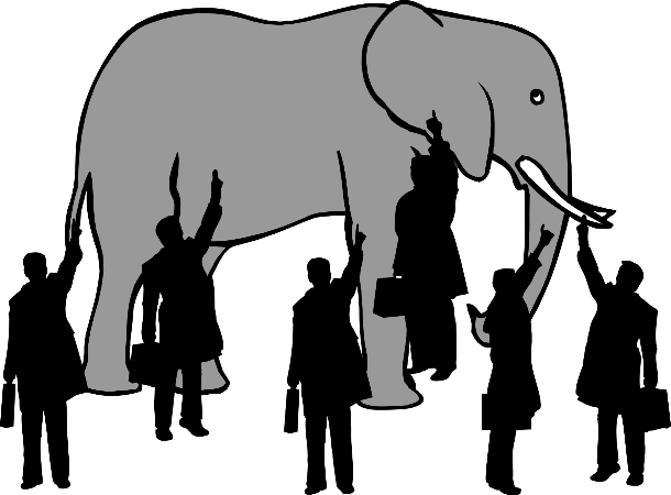 They began to argue about the “truth” of the elephant, each of them insisting that he was right. After a while, they became angry with each other. A wise man was passing by and saw their distress. "What is the matter?" he asked them. They said, "We cannot agree what the elephant is like." Each man then described what he thought the elephant was. The wise man calmly explained to them, "All of you are right. The reason every one of you is telling it differently is because each of you touched a different part of the elephant. The elephant has all of those features you described."
