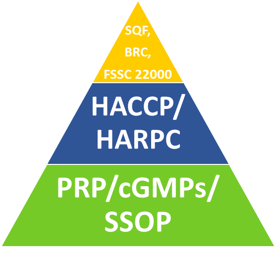 The crux of the FSP can be summed up in two words: preventive controls. Preventive controls are specific to a facility and product, taking into consideration the severity of a hazard as well as its likeliness of occurring. The process of preventive controls begins with understanding the food safety pyramid (not to be confused with the food group pyramid). As seen in the figure below, the foundation of every FSP should be well-written and effective Prerequisite Programs (PRPs), current Good Manufacturing Practices (cGMPs) and Sanitation Standard Operating Procedures (SSOPs). Quite often preventive controls will exist in these foundational programs.