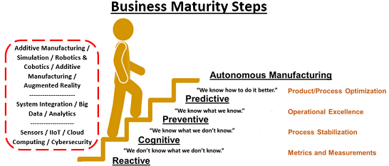 Once the organization has reached the point of trying to optimize business practices and begins looking at ways to design all variation and waste out of their products, processes and services, technology should again be considered. Ask yourself, for example, if inspection failures are an issue, can the process be automated through cobotics/robotics to ensure 100% performance of the task or to reduce measurement inaccuracies? Can augmented reality be used to provide relevant data in real time or to assist team members in achieving a higher level of training? Through simulation and virtualization, can failure modes be better predicted and then eliminated? And finally, could your product be better made using additive technologies rather than subtractive? Leveraging technology at this level to support product, workforce and process improvements can ultimately help a company achieve and maintain autonomous manufacturing.